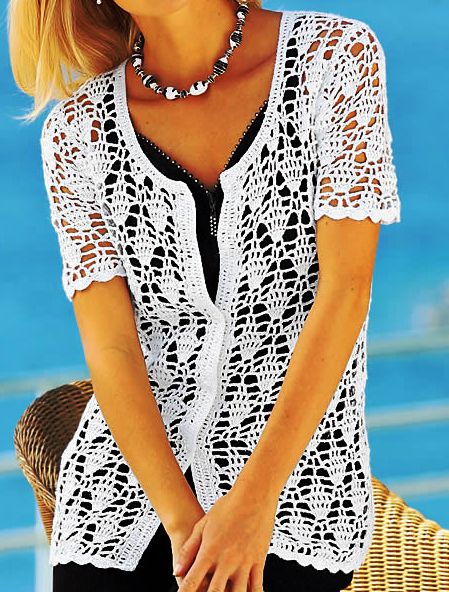 Product Name : 手勾貝殼花短袖開胸 (Short Sleeve Scallop Hand Crocheted Cardigan)