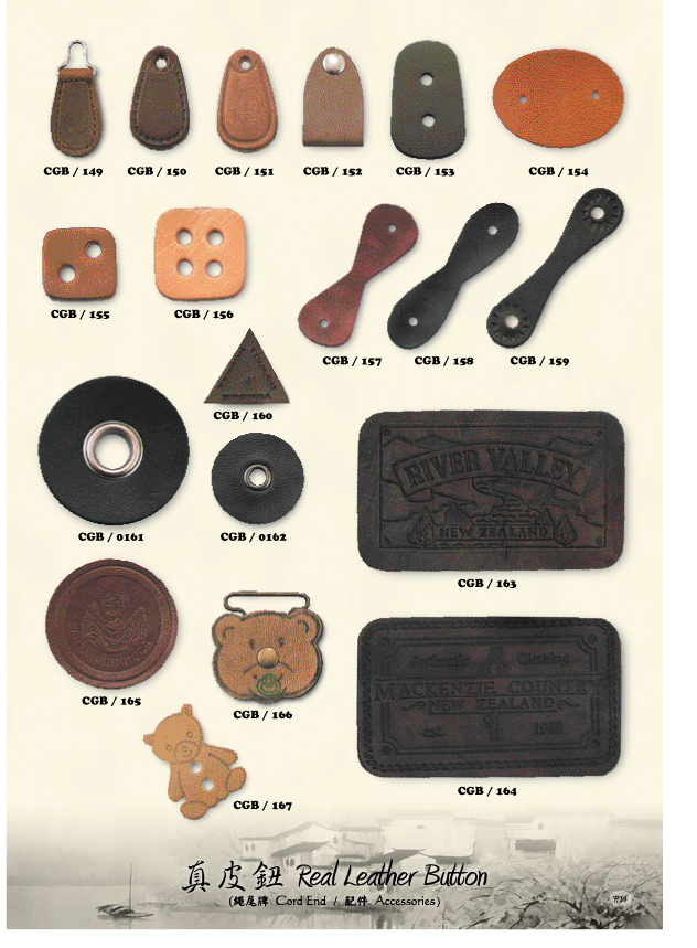 豐盛皮類製品廠,產品:(拉鏈牌、皮牌、繩尾牌、鈕、日字扣、皮錶帶及各類型配件等等......);