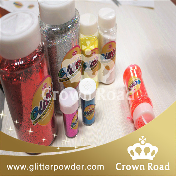 " Crownroad "glitter packed in cute bottle with different capacity for glitter shaker jar such like: 16oz, 8oz, 4oz,3/4oz,100g, till 5g per shaker jar.These are suitable for Shcool DIY artworks.  The Glitter powder is to enhance and enrich vision effect to make products a striking eye-catching attraction.