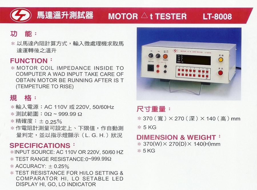 Product Name : | 馬達溫升測試器 Motor Temperature to Rise Tester - LT-8008 |