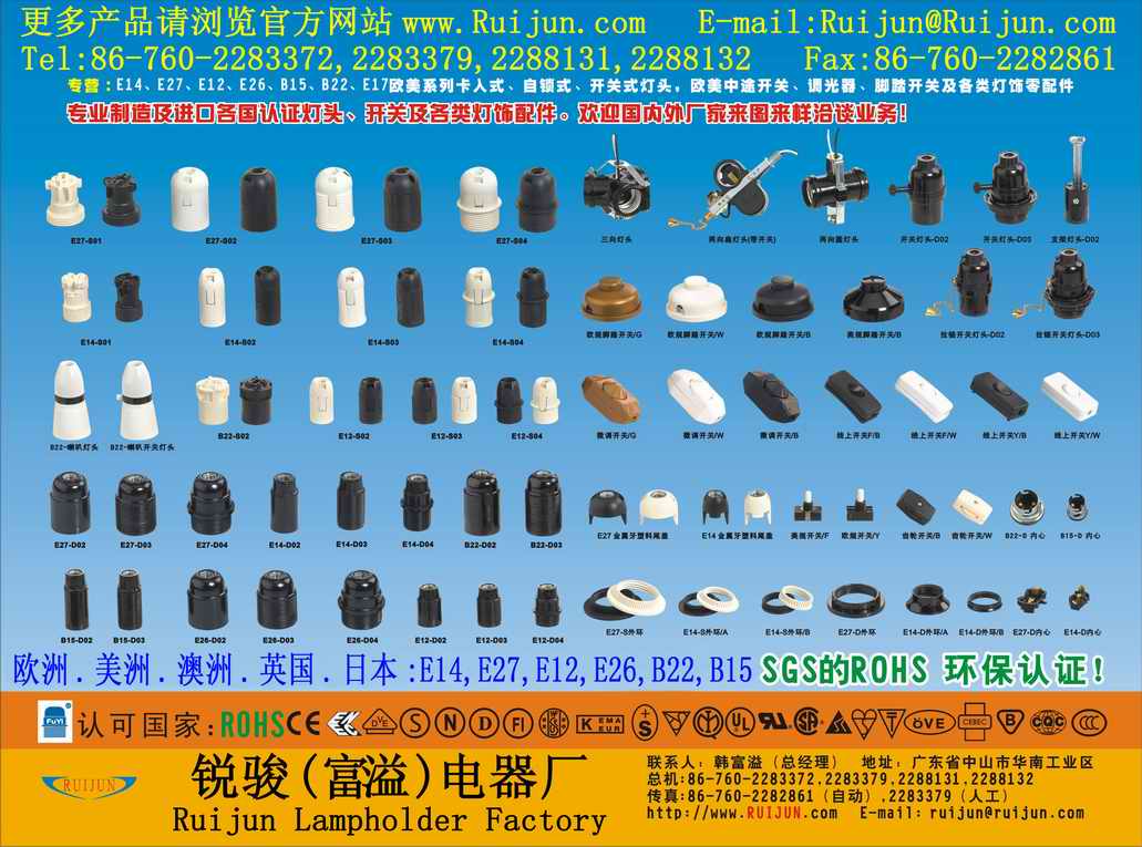 锐骏灯头灯座厂(www.ruijun.com)是广东一家专业制造和进口欧美各国认证灯座,灯头,开关和照明配件,灯饰配件,灯具配件的灯头灯座厂。